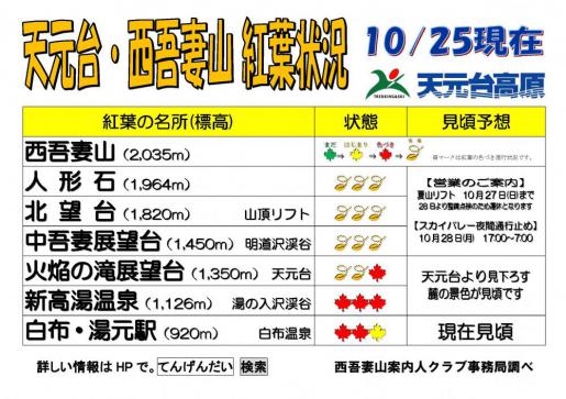 最新 天元台 西吾妻山紅葉状況 10 23時点 西吾妻スカイバレー規制情報 奥白布 新高湯温泉 吾妻屋旅館 アズナ王